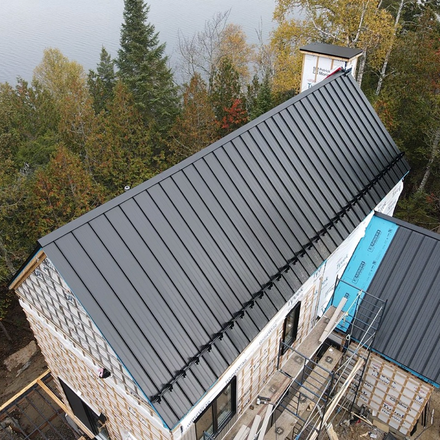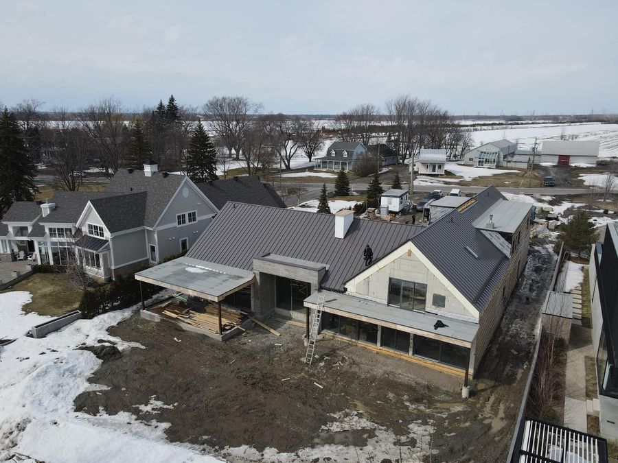 La toiture en acier offre des avantages considérables par rapport aux matériaux traditionnels. La neige s'accumule moins sur les surfaces métalliques, ce qui réduit les contraintes structurelles et minimise le risque de formation de barrages de glace – un facteur important pour les chalets et les résidences secondaires de Mont-Tremblant et des régions montagneuses environnantes. L'acier offre également une longévité exceptionnelle, une efficacité énergétique optimale et une esthétique raffinée.